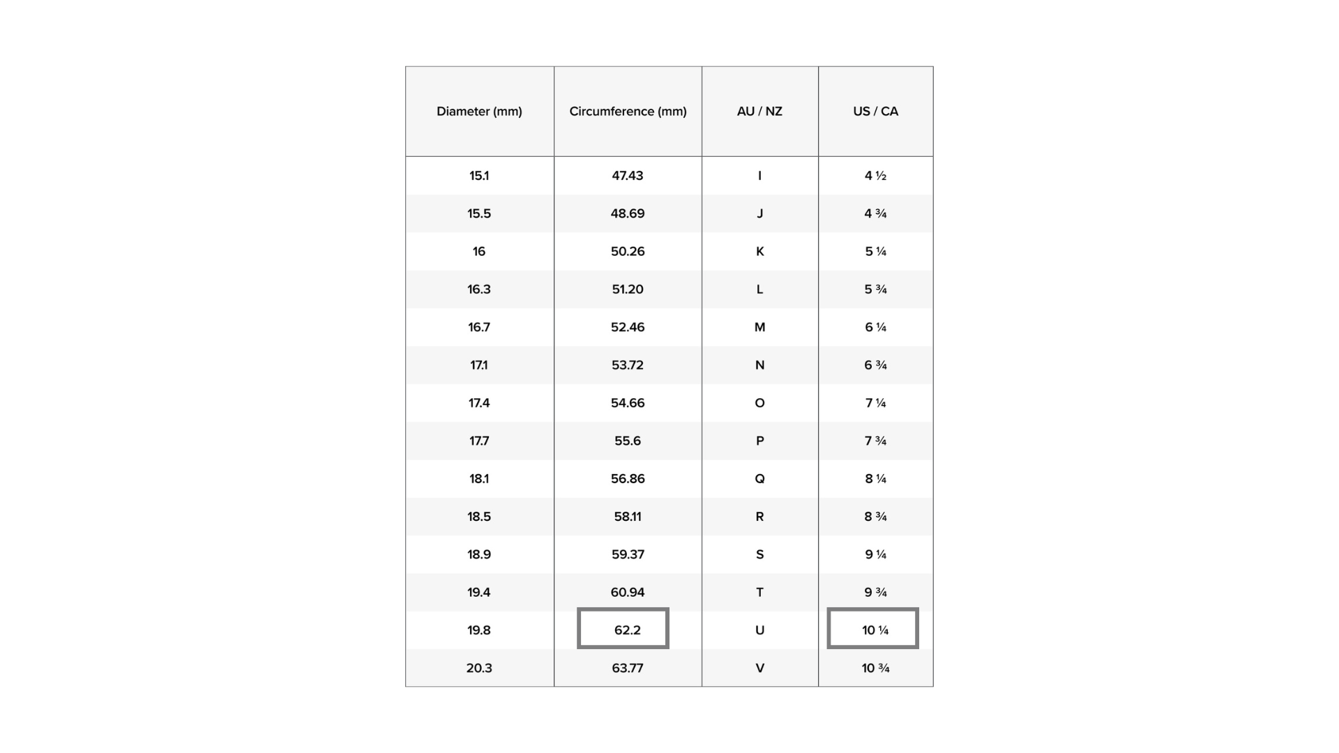 الخطوة الأخيرة: قومي بالإطلاع على جدول مقاسات الخواتم، ستجدون أن 62 خط تساوي مقاس 10 مما يعني أن مقاس الخاتم الذي يناسبني هو مقاس 10.